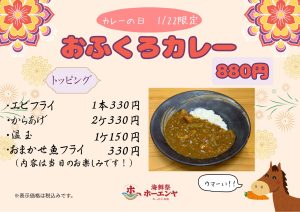 2026-01-10 | お知らせ 1月22日カレーの日 1/22(木)はカレーの日です 海鮮祭ホーエンヤわったいな店では、 1日限定で おふくろカレーをご提供いたします! かろばんや時代から働く、当店厨房のベテランスタッフが作るカレーを、皆様に食べていただきたく企画しました🍛💖 トッピングはメジャーな唐揚げはもちろん、海鮮丼屋ならではの魚フライもございます🐟 是非この機会にご賞味くださいませ! 皆様のお越しを心よりお待ちしております😌✨ Tweet < お知らせ一覧