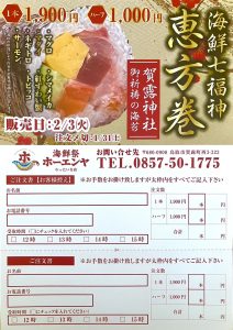 2026-01-16 | お知らせ 2月3日節分 恵方巻 2/3は節分👹🫘 今年も恵方巻きを販売します😊 賀露神社で御祈祷した海苔を使用しておりますので、とても縁起のいい恵方巻きになっております⛩️ 店内にて申込用紙もご用意しておりますし、お電話でも受け付けております! 申込締切日は1/31(土)、受取日は2/3(火)のみでございます 今年の恵方は南南東(やや南)です! 是非皆様で恵方を向いて願い事をしながらお召し上がりください☺️✨ 皆様からのご注文をお待ちしております😌 Tweet < お知らせ一覧